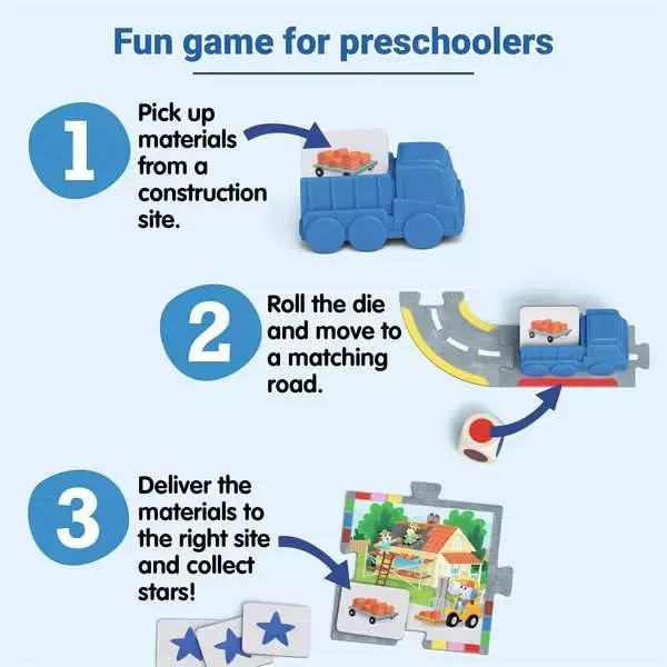 How to Play: Pick up materials from construction sites, roll the die and move your truck to the matching road, and deliver materials to the right site to collect stars.