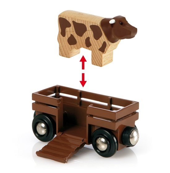 Back to nature! This retro design Farm Railway Playset lets your child lead the life of a farmer right from home! The cow is out on pasture while the tractor is taking the hay load to the barn. The crane then lifts the hay up onto the loft, for it to store and dry. When it is time to take the cow back in for the night, place them on the wagon with help from the fold out ramp and transport the wagon with the farm engine. Durable and educational, this real life playset encourages children’s imagination and the development of their fine motor skills.