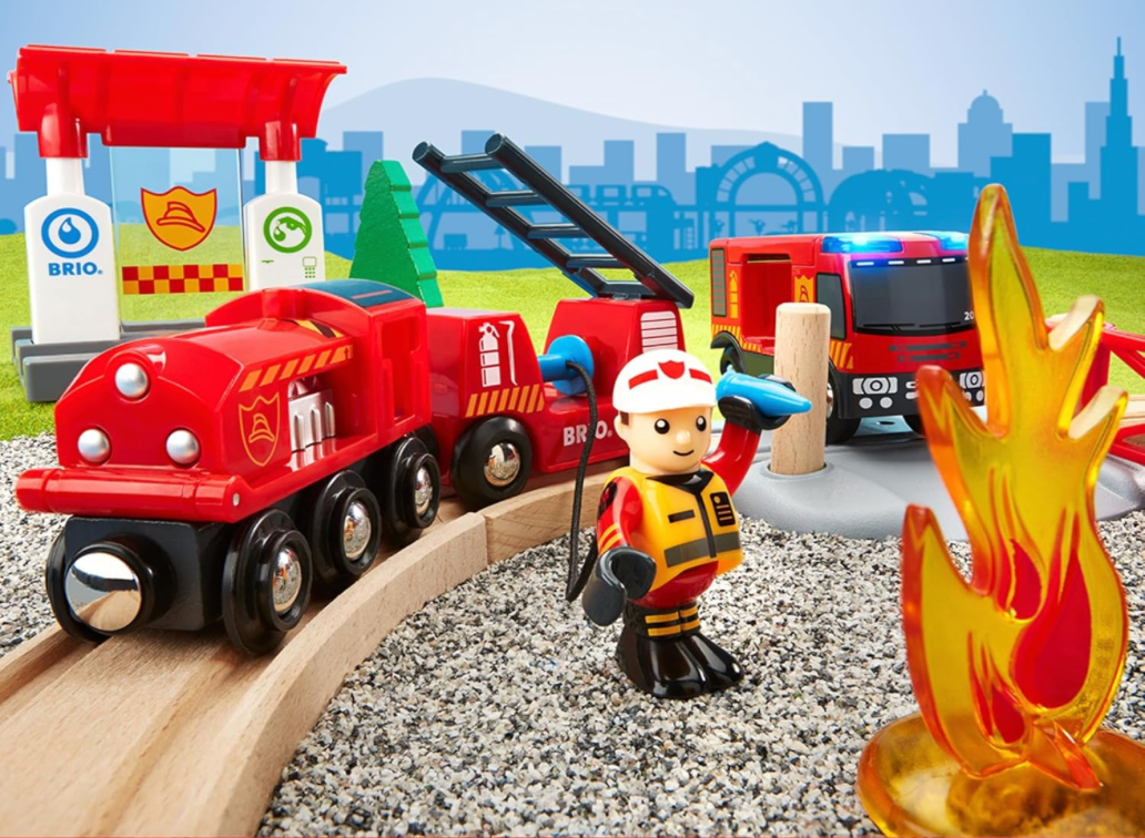This set includes wooden tracks, fire train with fire hose wagon, docking station, firefighter figure, fire truck with light and sound, gateway, wooden tree and fire