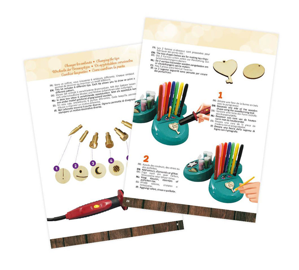 A safe workshop for engraving on wood and metal. Create and personalize 5 magnets, 5 key rings, 10 necklaces, and 1 bookmark! The wood burning tool is equipped with a guard to prevent burns and an ON/OFF key.