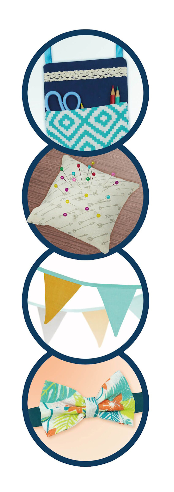 - 4 Trendy DIY Projects – Kids can learn to sew by making bunting, a pincushion, a bow tie, and hanging storage pockets, combining fun and function.