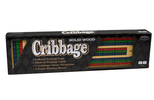 3 track wooden cribbage board with 9 metal scoring pegs. Also includes a deck of playing cards and instructions for 7 game variations.