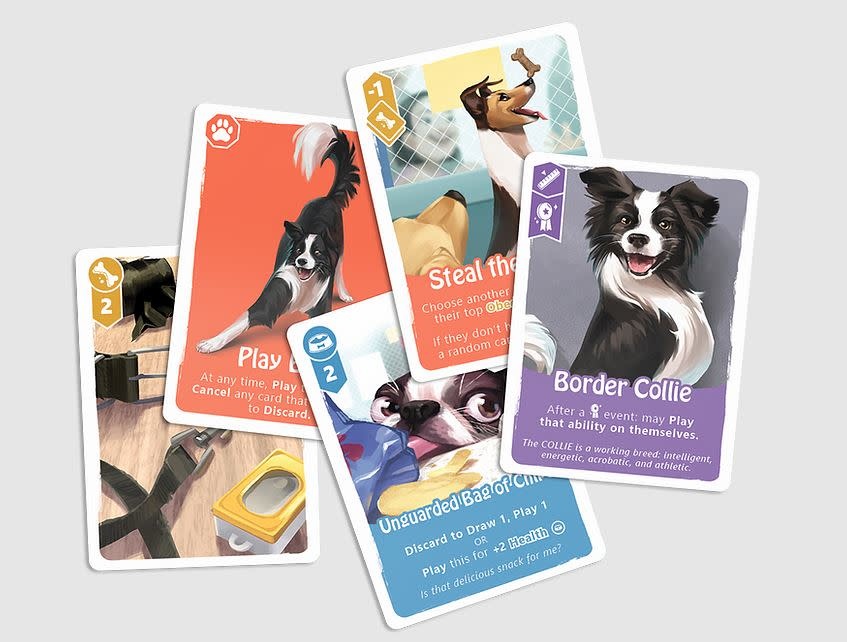 Each turn consists of drawing an event card, then drawing and playing appropriate attribute cards to build out your dog's attributes (Grooming, Obedience, Temperament, and Health) to meet requirements set by each adopter. You can play for one adopter or many, and they all have different ideas about what makes the perfect dog!