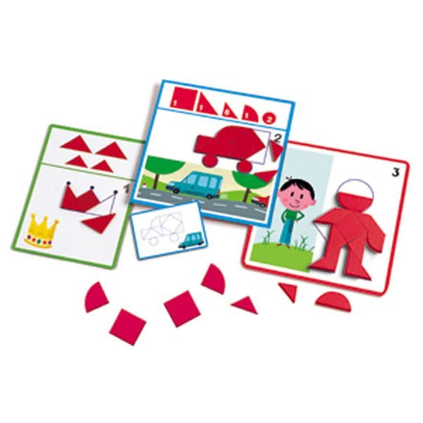 This is a fun shapes activity kit from Djeco for kids ages 3-6 to learn about geometry. Includes 36 wooden shapes, and several cards to follow.