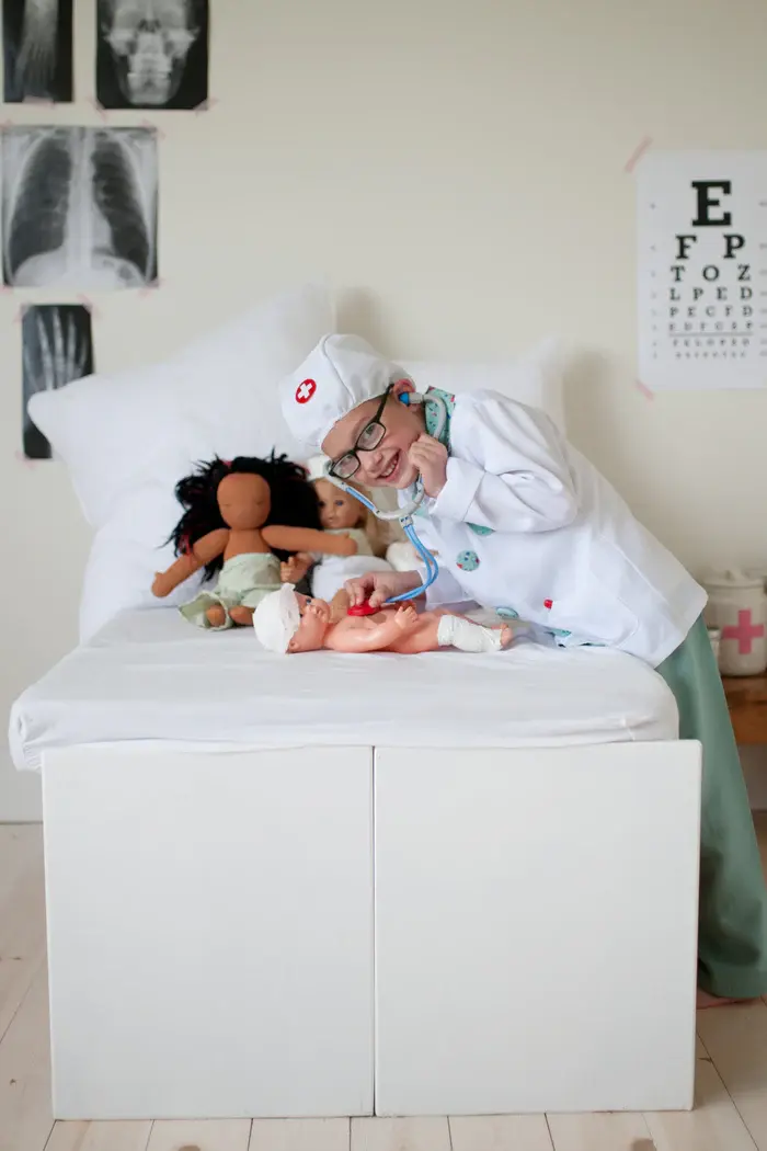 Contains: Lab coat, pants, mask, hat, stethoscope, syringe, name tag and thermometer