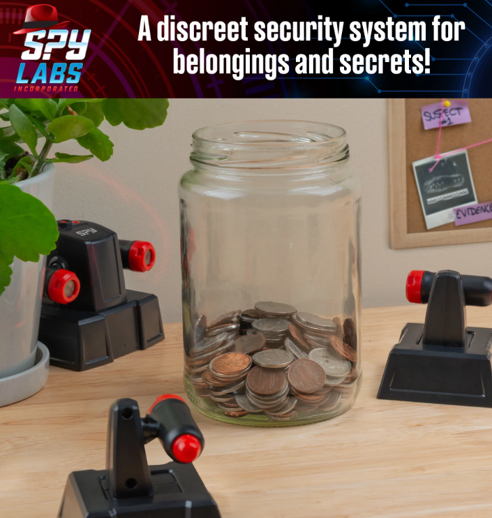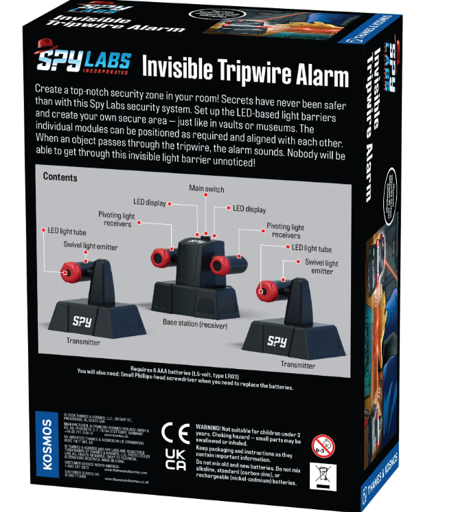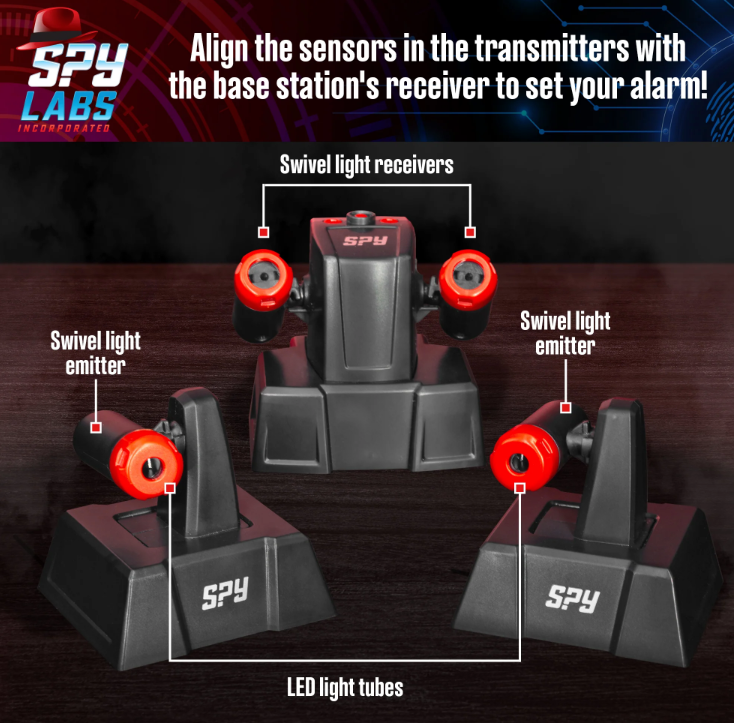 Create a top-of-the-line, 360-degree security zone in your room! Secrets have never been safer than with this Spy Labs security system. Activate the LED beams in the two transmitters with a push of a button, then align the light beams with the receivers on the base station to create an invisible tripwire. When the barrier is breached or interrupted, the alarm sounds and the interloper is revealed!