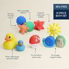 Make a splash! Have some good clean fun with our 10 colorful bath toys in the Itzy Splash Gift Set™. These soft, squeezable, water-squirting characters and shapes encourage motor skill development and are great for creating endless bath time adventures!