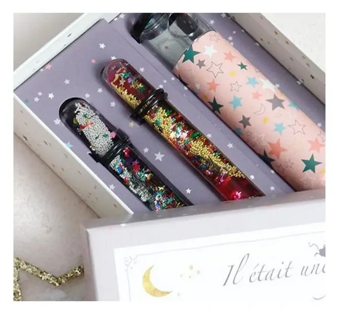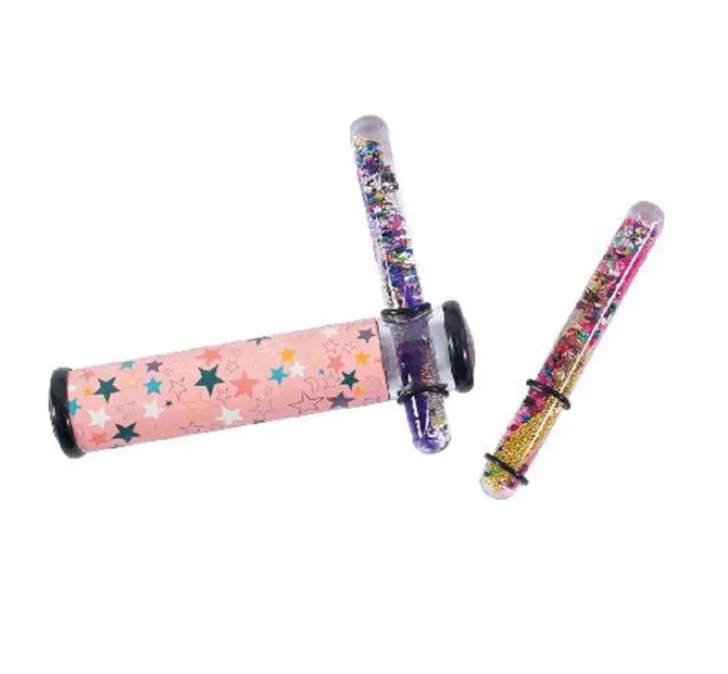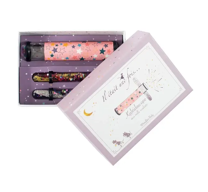This beautiful illustrated set includes a starry kaleidoscope with 2 sliding tubes containing gel and glitter. The combinations of shapes and colours are endless!