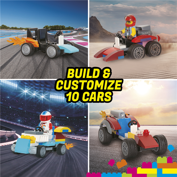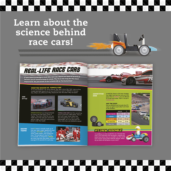The ultimate kit for LEGO fans and car enthusiasts alike! Assemble a high-quality chipboard track to set the scene for your LEGO derby, then pick two cars to build following the step-by-step instructions and pit them against each other. After you race your cars, pick two more cars, and then race them again! Who will win--Phoenix '77, Winged Chariot, El Scorpio, or perhaps even a souped-up build you've customized yourself? Fun, non-fiction content highlights the coolest, fastest, and weirdest cars to ever exist. (Do you know the differences between NASCAR and Formula One? Did you know there's a car that runs on coffee?!) Learn aerodynamic tips and tricks to put physics into action, with this playful STEM kit that lets you build, rebuild, and experiment to create the best car in your LEGO collection.