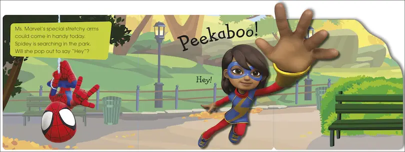 The lively, read-aloud rhymes encourage literacy and early learning, while the surprise pop-up scenes will delight curious preschoolers. With the help of parents and caregivers, children will have fun turning the sturdy board book pages, guessing what’s hiding under each flap, and then lifting the flaps to reveal Spidey and his friends, and play peekaboo!