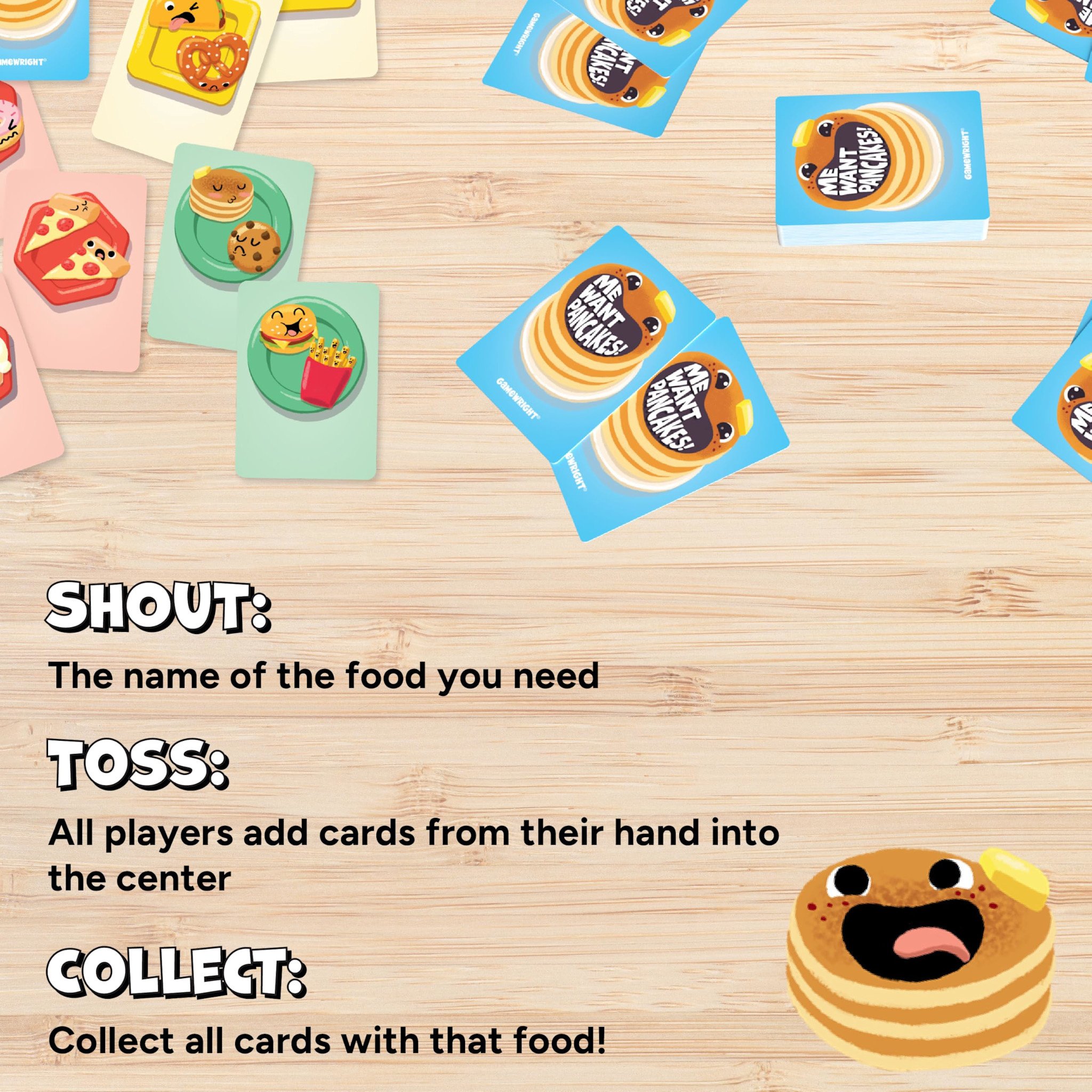 - EASY TO LEARN WITH SIMPLE RULES FOR KIDS: Me Want Pancakes! is designed for quick gameplay with minimal setup, making it an ideal card game for kids and adults alike. Players of all ages can jump in and start playing within minutes, ensuring an enjoyable experience for families, friends, and even newbie gamers.
