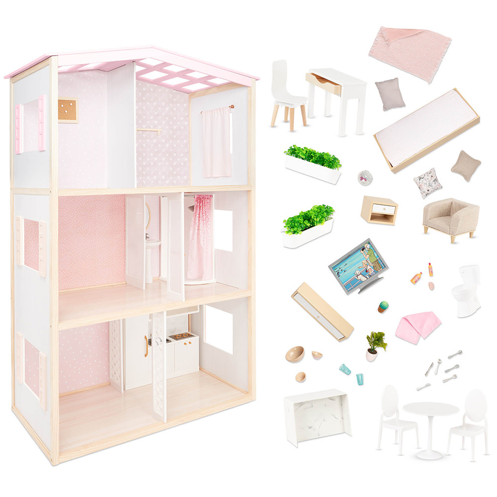 Discover our splendid three-level Doll's House, the dream of every little princess! This house offers ample space for limitless creativity. Supplied with a complete collection of furniture and accessories for each room, your child can furnish and decorate the house to her heart's content. From the comfortable living room to the well-equipped kitchen, every detail has been carefully designed to create an enchanting imaginary world. Give your child hours of playtime and wonderful memories in this exceptional Doll's House.