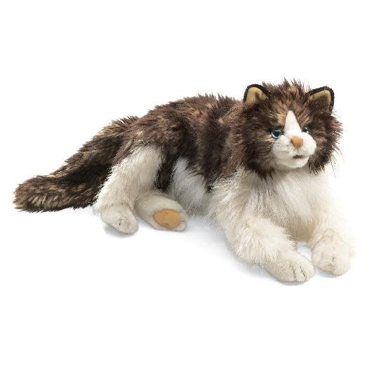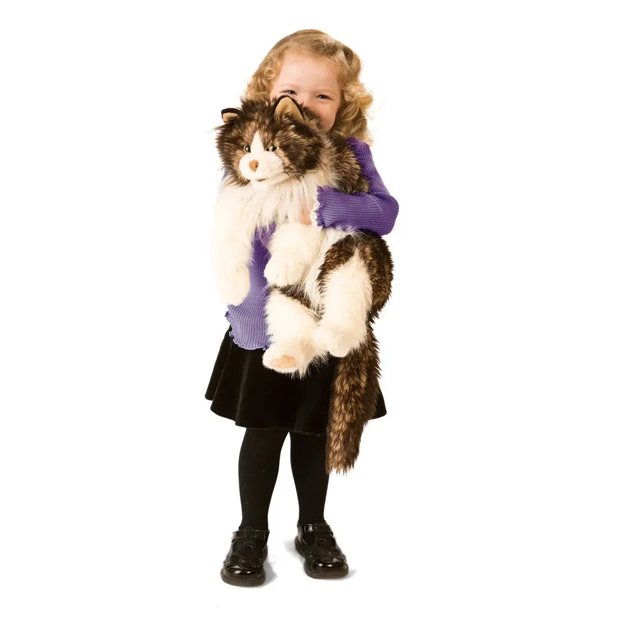 Snuggle up with this furry, floppy realistic feline. This Ragdoll Cat is true to its breed. With relaxed paws and a long fluffy tail, it looks almost boneless! Put side by side with a real live cat and it would be hard to tell the difference. Made of long, chocolate tipped plush with white markings.