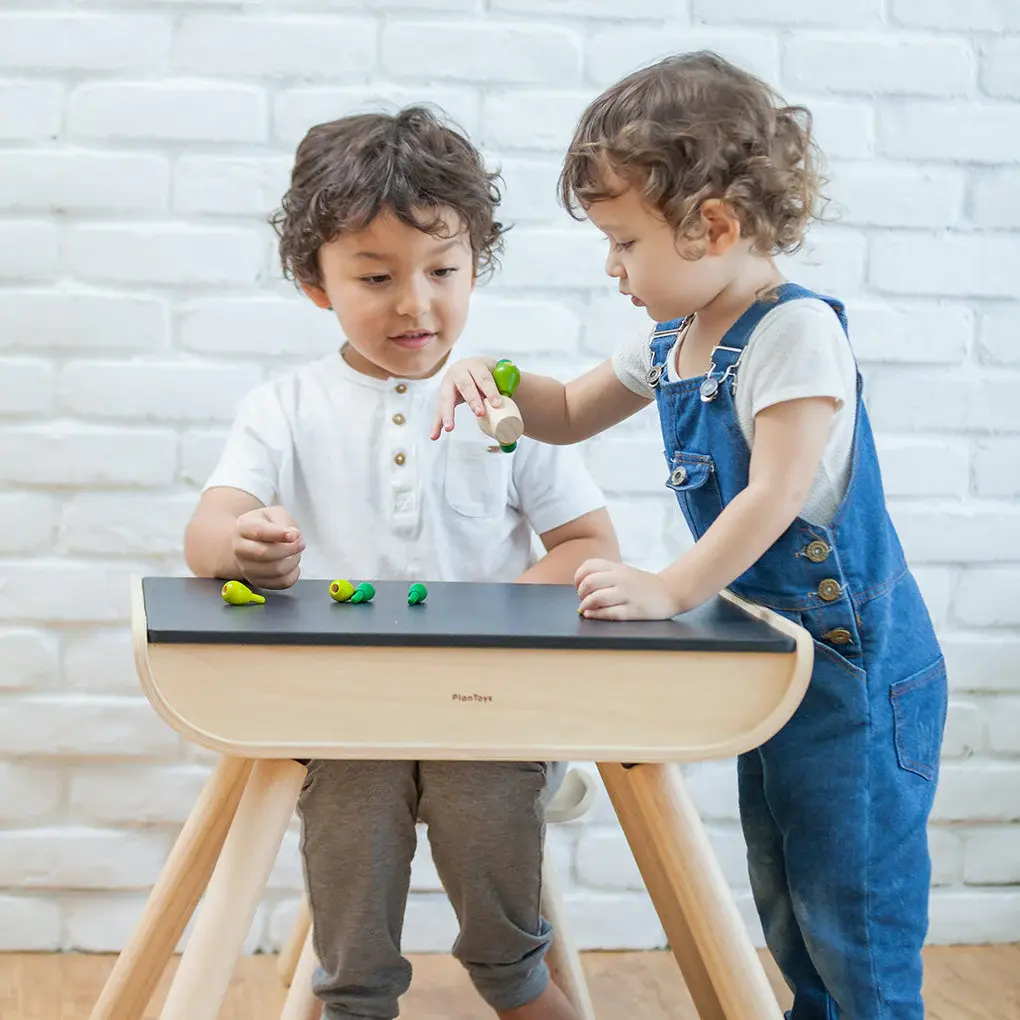 - Features 2 compartments for storage and a chalkboard desktop that toddlers can draw or write on
